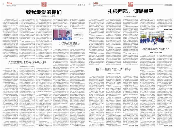 研究生支教团事迹。作为其中的一员,吕子良参与中宣部志愿服务促进中心、中国青年志愿者媒体中心线上文化宣传志愿,运营“中国志愿”“西部志愿汇”公众号,编辑推送200余篇,阅读量超过400000人次。