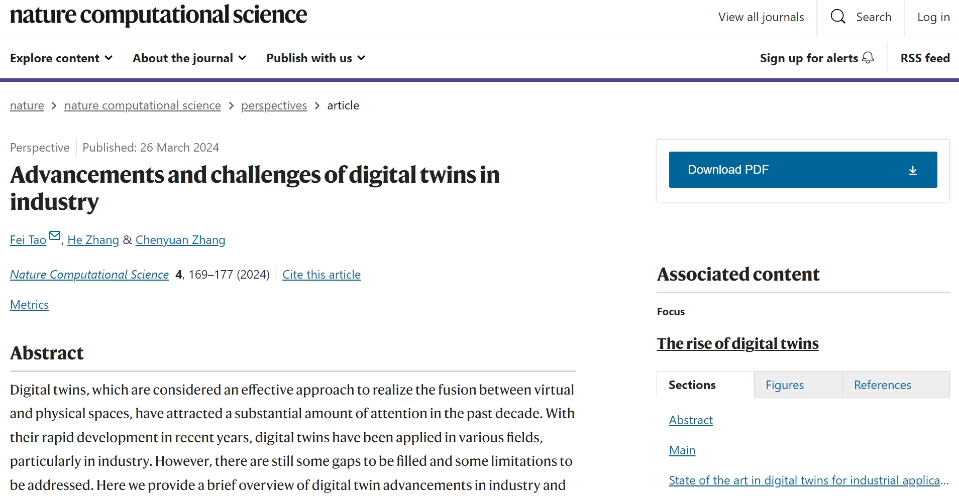 3月27日,陶飞教授团队受邀在《Nature Computational Science》杂志发表了工业领域数字孪生的综述与最新视角长文文章:《Advancements and challenges of digital twins in industry》。该文章对国内外数字孪生在工业领域的最新研究与应用进展进行了总结,深度剖析了数字孪生理论研究与工业实践过程中存在的问题及面临的挑战,并指明了未来发展方向。陶飞教授、张贺博士后、博士生张辰源为该文作者,陶飞教授为通讯作者,肉文阁