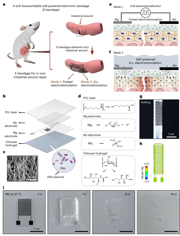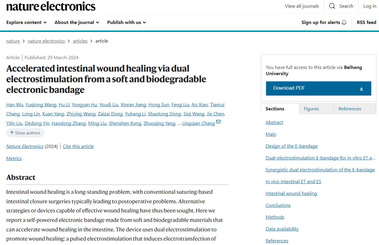 3月29日,常凌乾教授团队报道了一种柔性、可生物降解、自供电电子绷带,能够提供双模式电刺激,协同加速和改善肠道伤口愈合,并显著减少了术后并发症。相关成果以“Accelerated intestinal wound healing via dual electrostimulation from a soft and biodegradable electronic bandage”为题,发表在《Nature Electronics》上。北航生物与医学工程学院博士生吴晗、王玉琼博士、李虎博士等为第一作者,北航常凌乾教授、王柳助理教授,宾夕法尼亚州立大学余存江教授为通讯作者,肉文阁