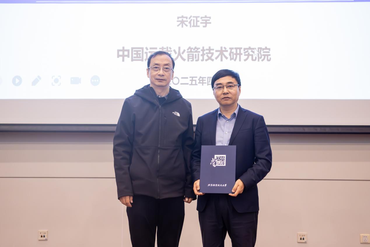 焦宗夏院士为宋征宇总师颁发“北航大讲堂”荣誉证书。本次讲座不仅展示了我国航天控制技术的重大成果,也为未来技术的发展方向提供了宝贵的参考。希望广大学子通过本次讲座,坚定对航天科技的信念,在探索未知的征程中勇攀高峰,为我国航天事业贡献力量。