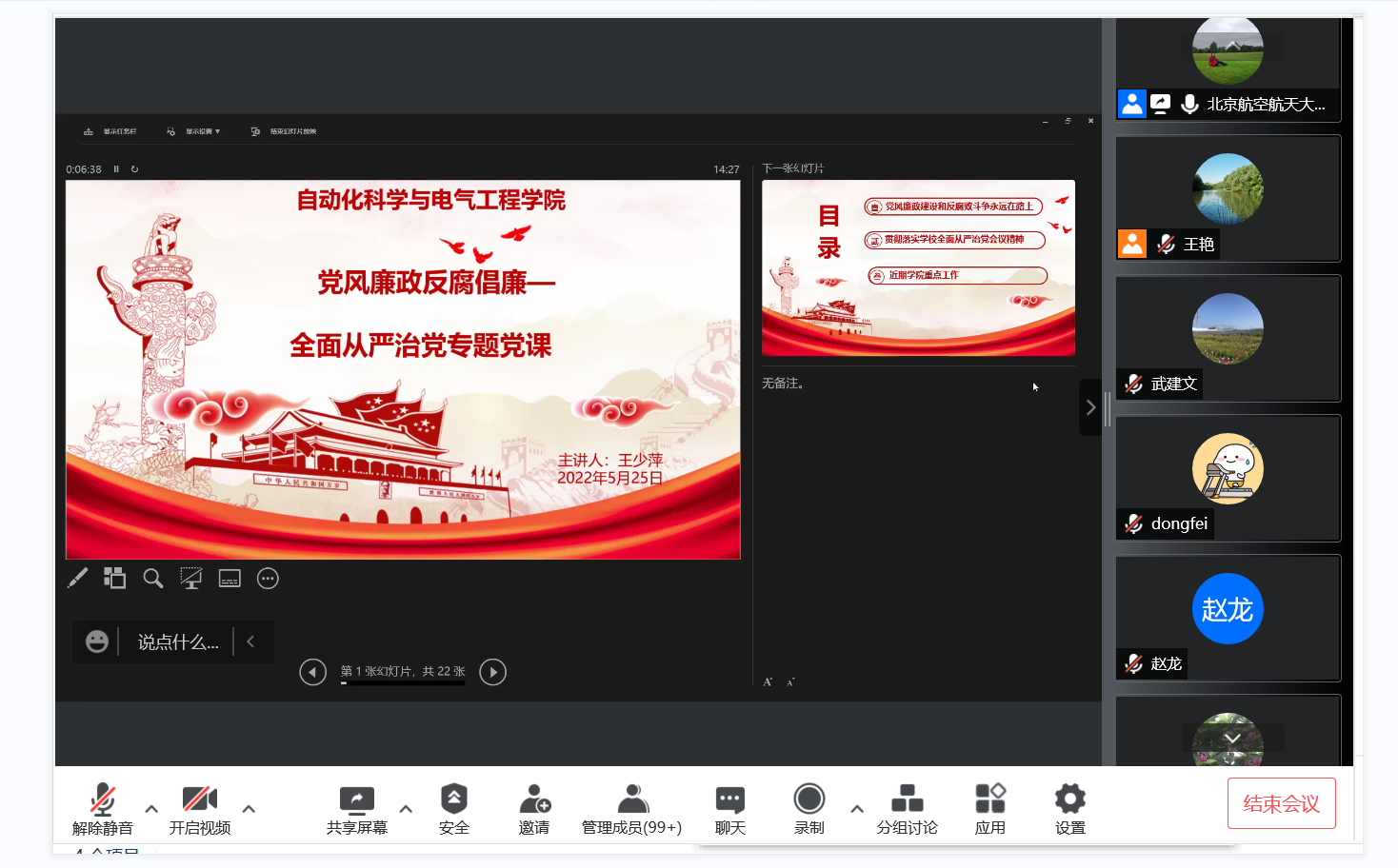 党委书记王少萍做了“从严治党暨党风廉政建设”专题党课。会议以线上腾讯视频会议方式进行,学院全体教职工参加了本次集体学习活动。