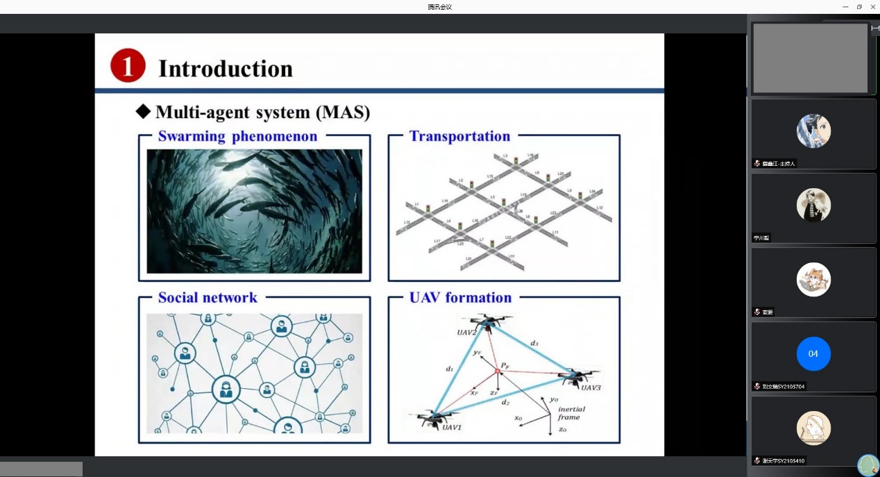 2018级博士生张璟尧同学。他以“非线性多智能体网络系统在切换拓扑下的分布式迭代学习控制”为题,整合其发表在AUTOMATICA和IEEE TAC上的两篇论文研究内容进行汇报。张璟尧同学首先简要介绍了迭代学习控制的基本原理与优缺点,并以行进乐队为例,对迭代学习控制的对象——多智能体系统的相关特点与控制目标进行了阐述。随后引入代数图论、联合生成树等知识,设计分布式迭代学习控制协议,将全局Lipschitz条件放松为局部Lipschitz条件,通过理论推导、数值仿真等手段,回答了在具有切换拓扑的非线性多智能体网络系统中如何实现分布式迭代学习控制这一问题。
