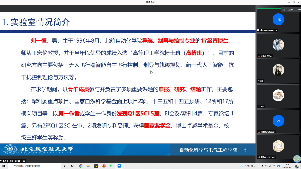 2017级博士研究生,师从王宏伦教授。汇报开始,刘一恒同学简要介绍了个人信息与课题组概况,随后围绕“无人机软式空中对接与回收抗扰动快速精准控制技术研究”,从“无人机空中对接与回收控制”、“高超智能制导与控制技术”、“无人机自主空中加油对接控制技术”、“飞行器空中态势感知与自主避撞技术”、“运载火箭上面级智能在线重规划技术”五个方面展开介绍,明确阐述了研究工作的重要性与难点,并通过大量图表、仿真结果、实验结果,直观地展示了其在博士期间丰富的科研成果。最后,刘一恒同学分享了自己在多年科研生活中总结出的宝贵经验,强调了明确研究方向、提前做好未来发展规划的重要性,分析了项目与科研的互补作用,也叮嘱大家要注意身体、健康生活。